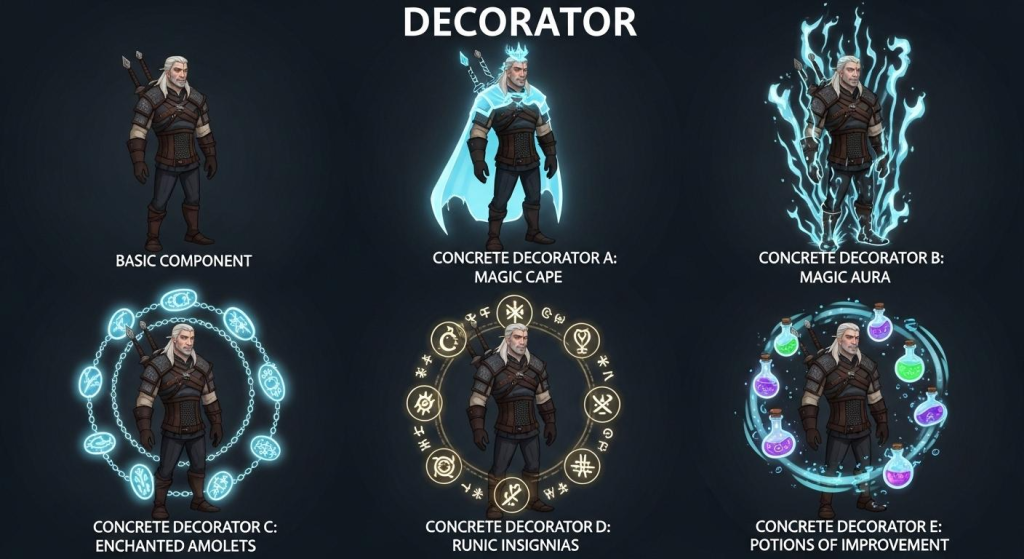 Application in games: This pattern is widely used to implement systems of buffs, power-ups, and equipment customization, as seen in Diablo and Cyberpunk 2077. For example, an item can be decorated with magical effects or temporary attributes, allowing multiple modifiers to be combined and managed efficiently.